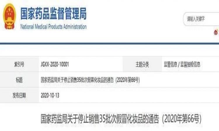 10月13日,国家药品监督管理局官网发布了关于停止销售35批次假冒化妆品的通告(2020年第66号)。